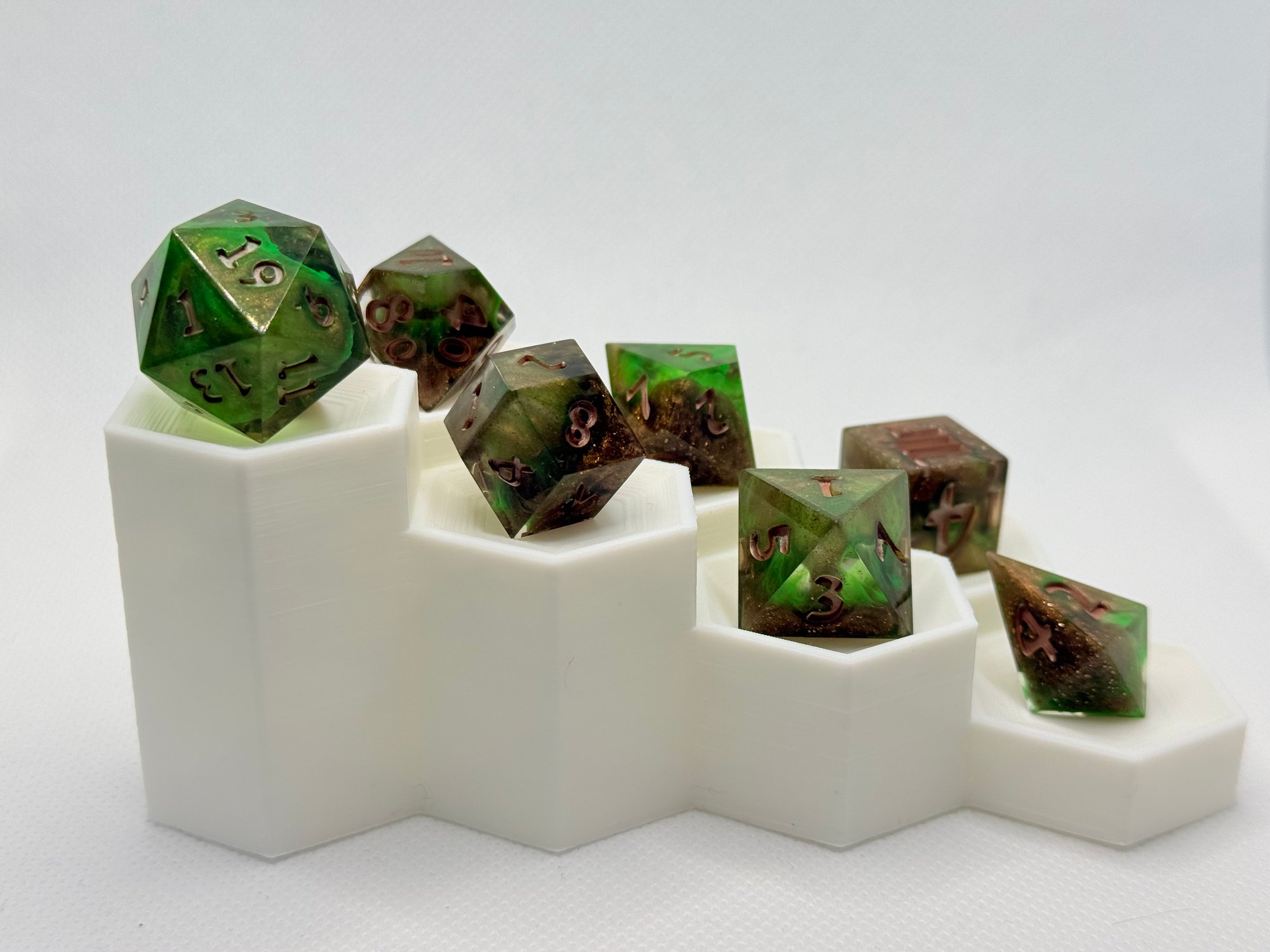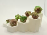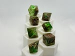 This dice set features a vibrant blend of emerald green and earthy brown tones with subtle shimmer throughout, complemented by tan numbering.