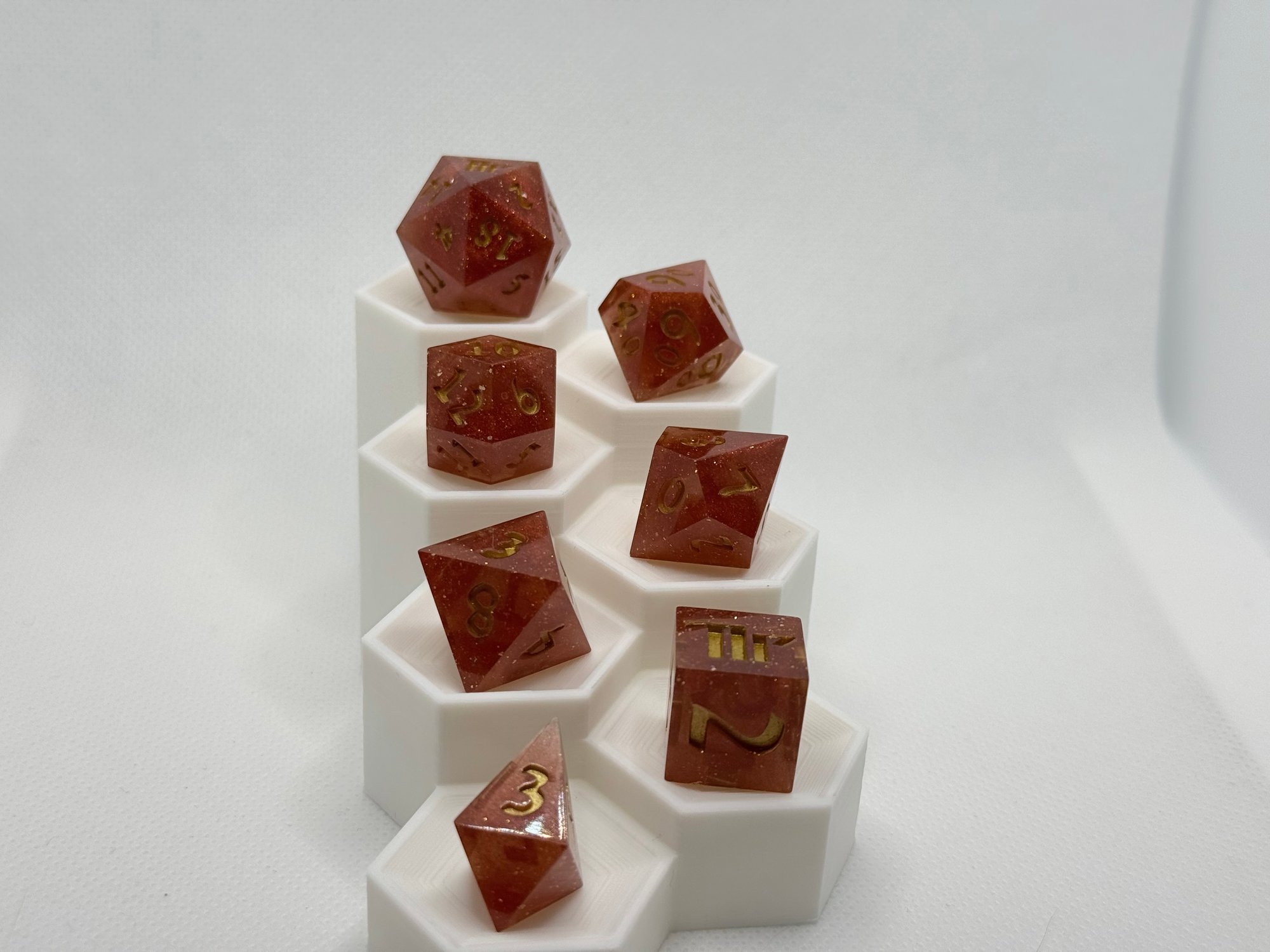 This dice set features a warm reddish-orange tone with fine golden shimmer and gold numbering, giving it a glowing, sunlit look—like embers cooling in the dusk.