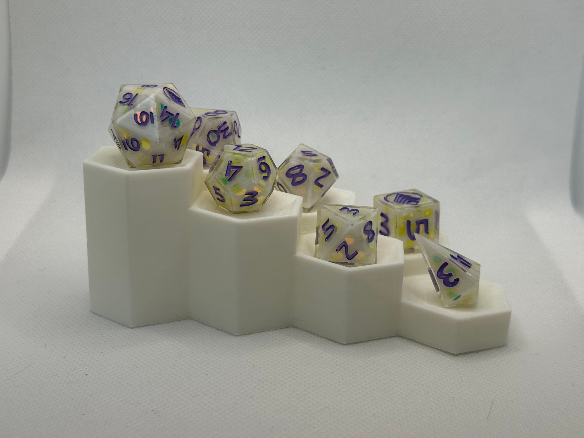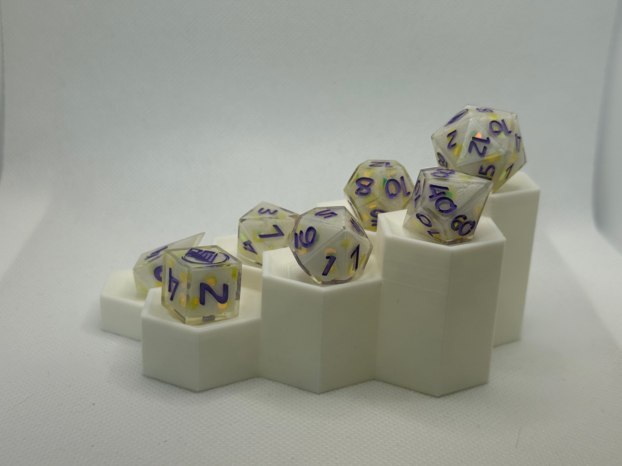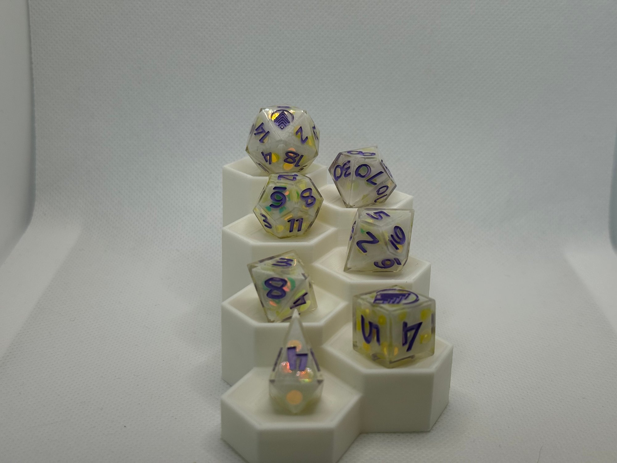 Radiant and playful, Prismatic Veil features a milky white base scattered with iridescent mylar dots that shimmer in every color of the spectrum. The bold violet numbering adds a magical contrast, making this set sparkle like enchanted confetti caught in moonlight.