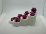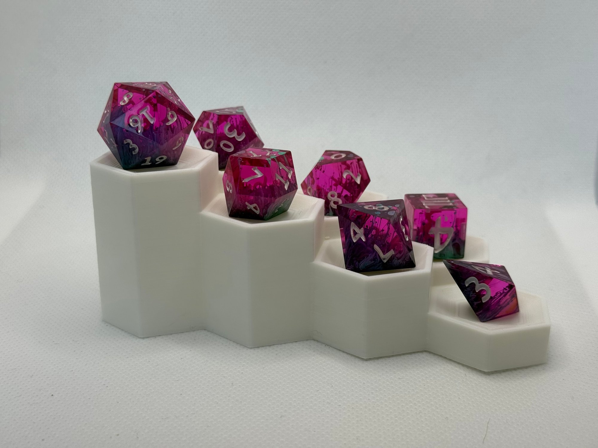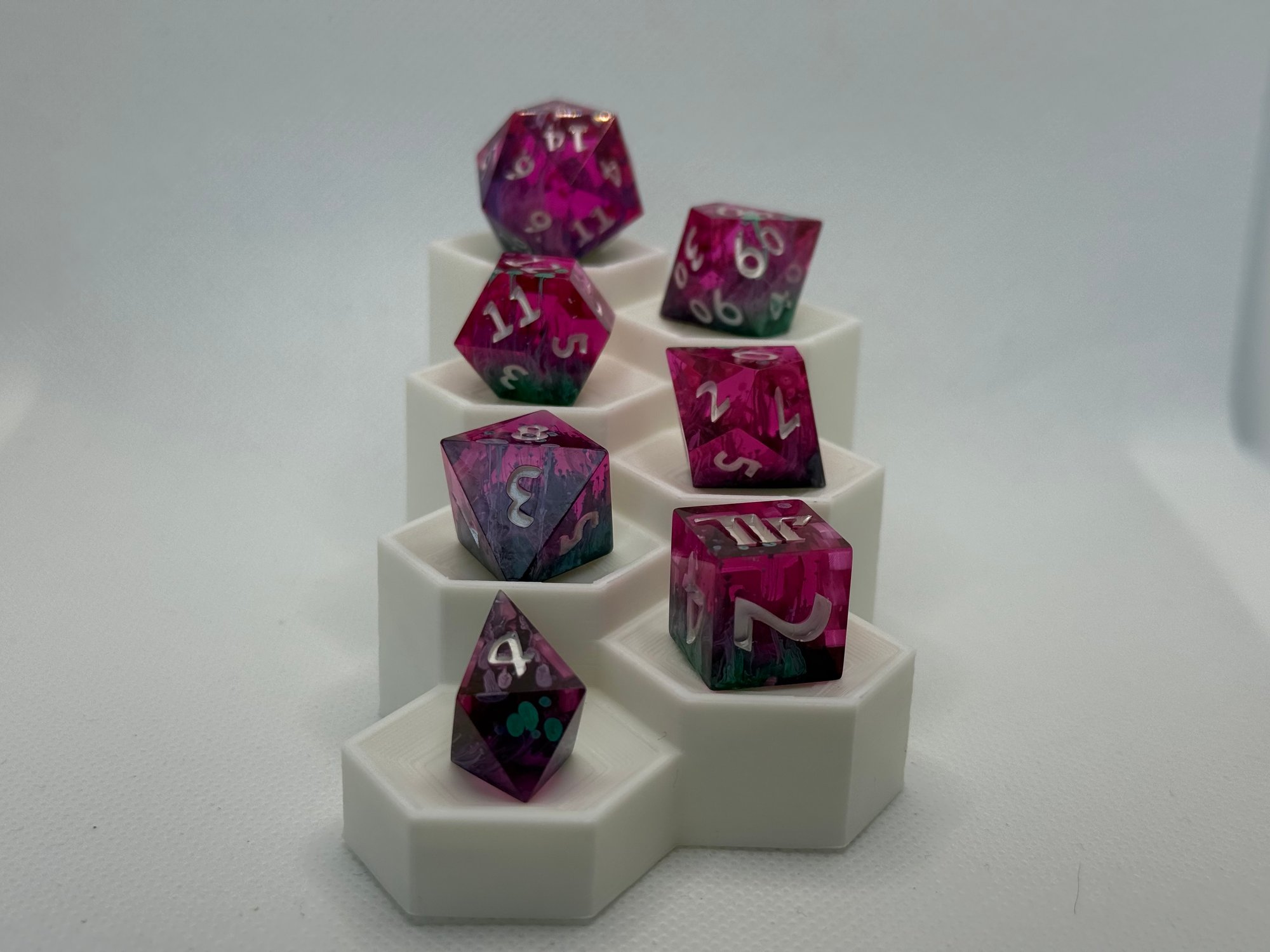 Brilliant and ethereal, Stained Glass captures the beauty of sunlight through colored glass. Vivid pink, emerald green, and royal purple swirl together in radiant harmony, creating a luminous play of color with every roll. Finished with crisp white numbering, this set gleams like enchanted cathedral windows brought to life.