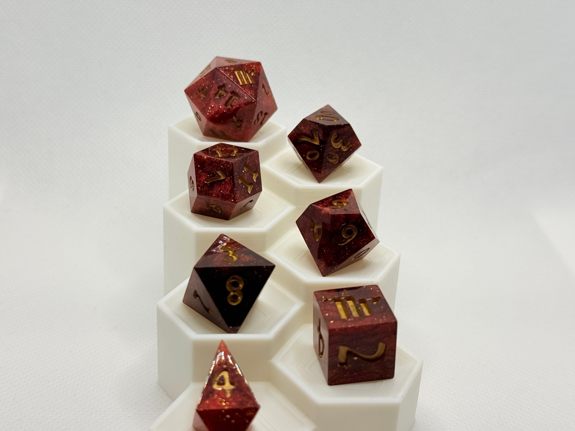 Unleash your inner predator with Tiger’s Blood, a captivating blend of deep crimson, inky black, and gold shimmer. Each die glows with molten undertones, evoking the raw strength and elegance of a tiger in motion. Gold numbering adds a regal touch, ensuring every roll feels bold and powerful.