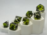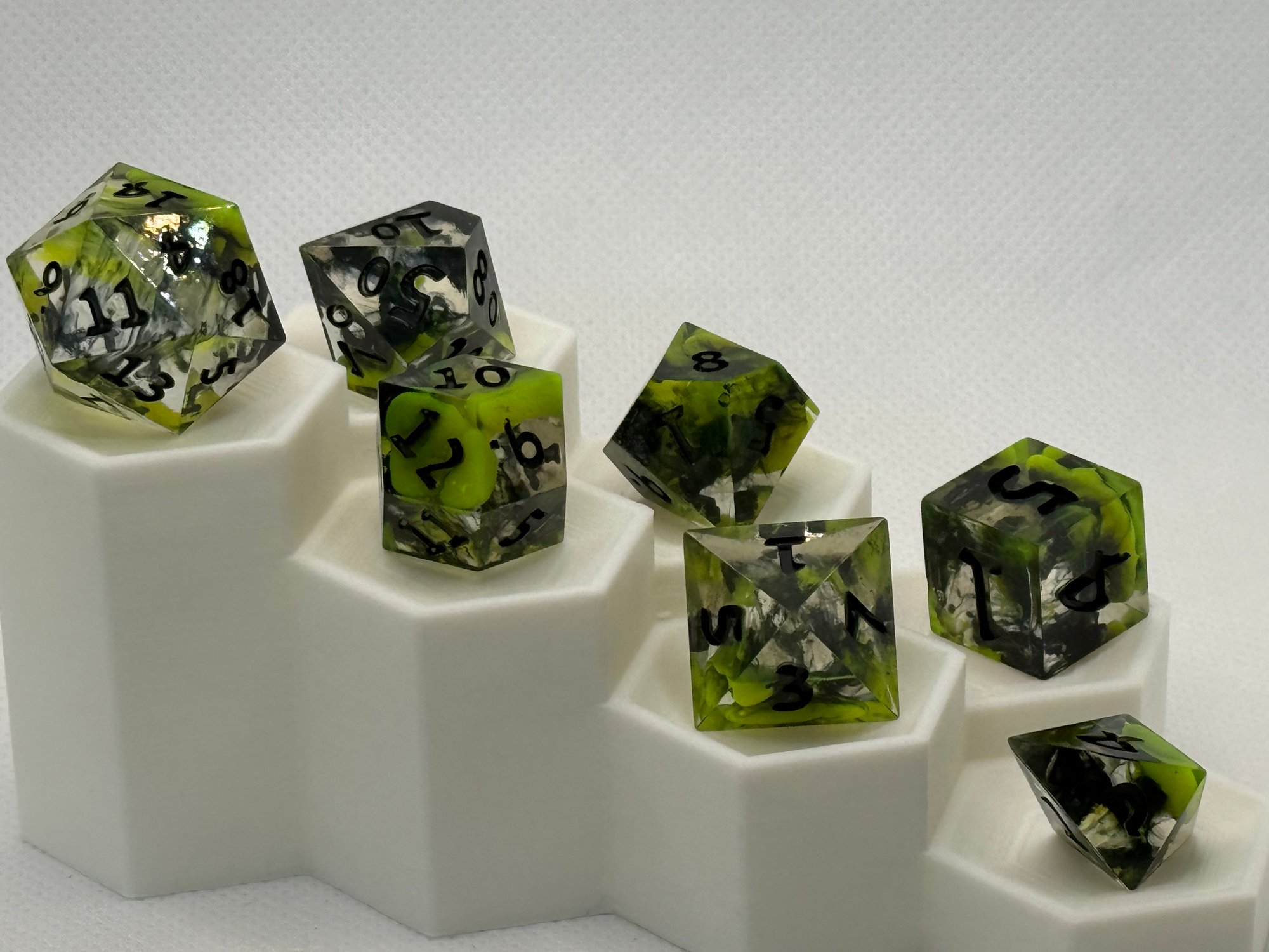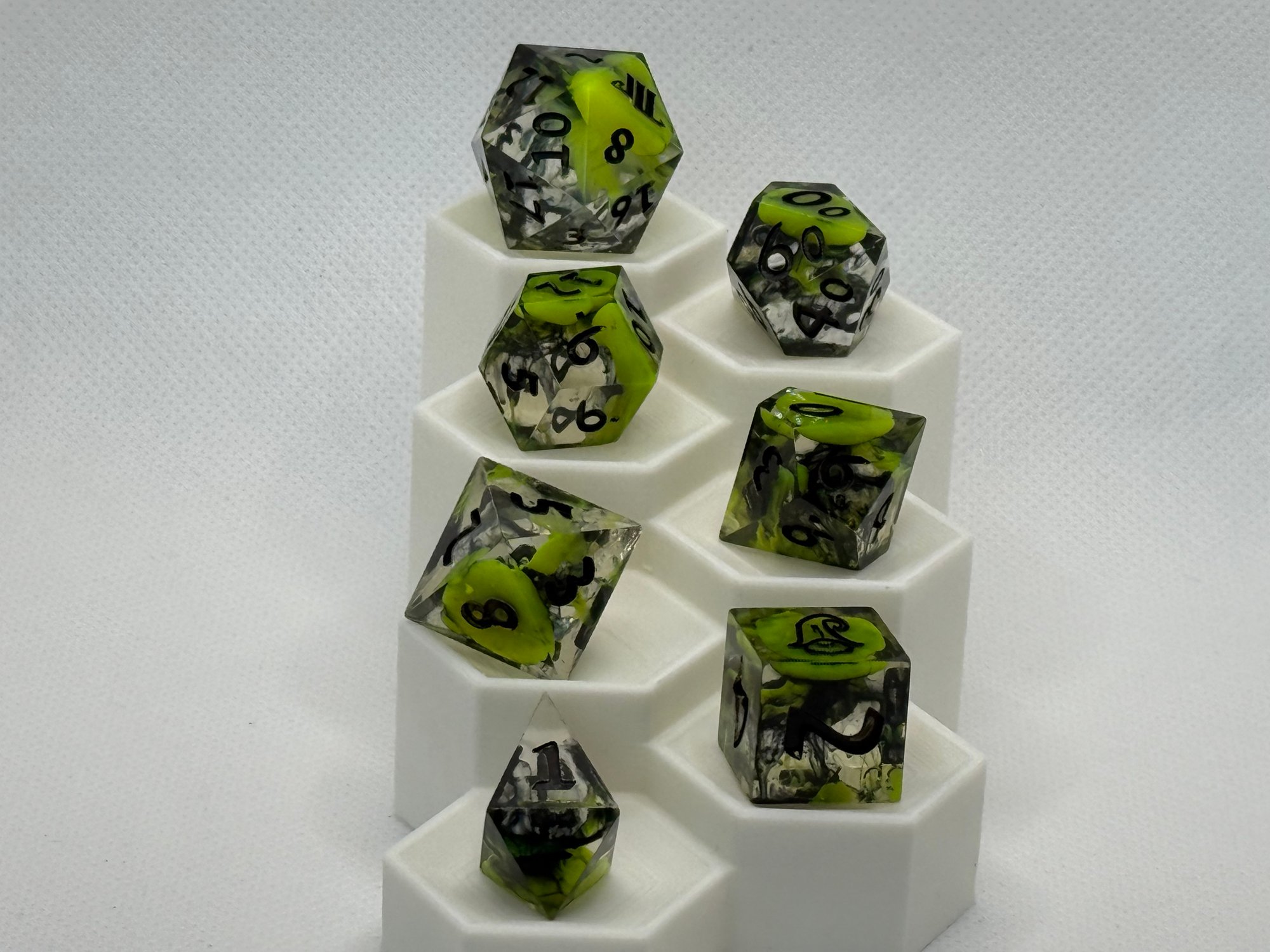 Radiant and dangerous, Toxic Bloom captures the moment beauty meets chaos. Vivid neon green petals swirl through smoky black and clear resin, creating a striking contrast that feels alive with volatile energy. Finished with sharp black numbering, this set is perfect for adventurers who find elegance in the unexpected.